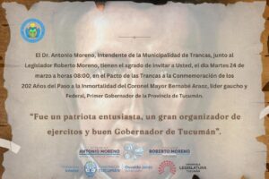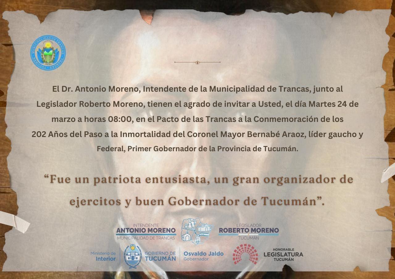 La Municipalidad de Trancas invita a toda la comunidad a participar del acto conmemorativo por los 202 años del paso a la inmortalidad de Bernabé Aráoz, figura clave de la historia provincial, reconocido como líder gaucho, federal y primer gobernador de Tucumán. La actividad se llevará a cabo el próximo martes 24 de marzo a…