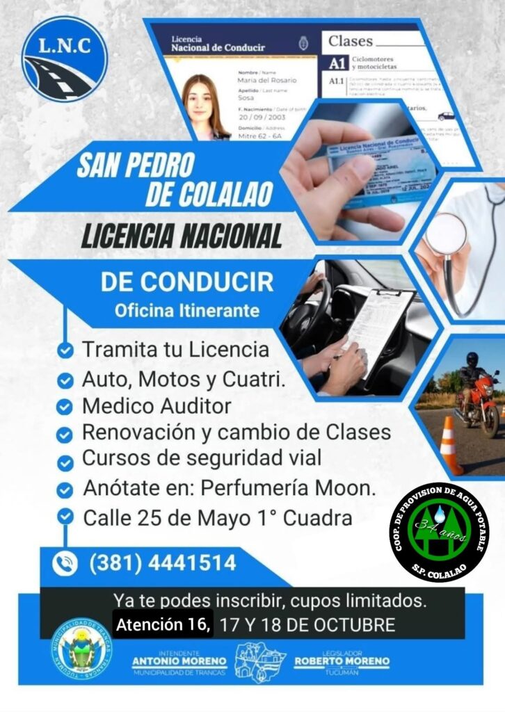En respuesta a un pedido reiterado de la comunidad, se pone en marcha un operativo especial de la Oficina Municipal de Licencias de Conducir en San Pedro de Colalao. El servicio será coordinado junto a Antonio Moreno, a través de la Oficina de Lnc Trancas, y estará destinado a todos los sanpedreños y sanpedreñas que solicitaron esta atención en territorio.