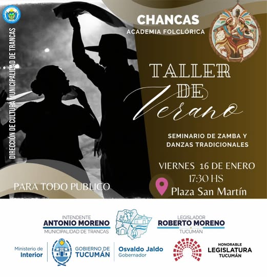 La ciudad de Trancas se prepara para vivir una jornada especial dedicada al folclore y a las raíces culturales que forman parte de su identidad. Este viernes 16 de enero, desde las 17:30 horas, la Plaza San Martín será escenario del Taller de Verano – Seminario de Zamba y Danzas Tradicionales, organizado por la Academia Folclórica Chancas, dependiente de la Dirección de Cultura, con el acompañamiento de la Municipalidad de Trancas.